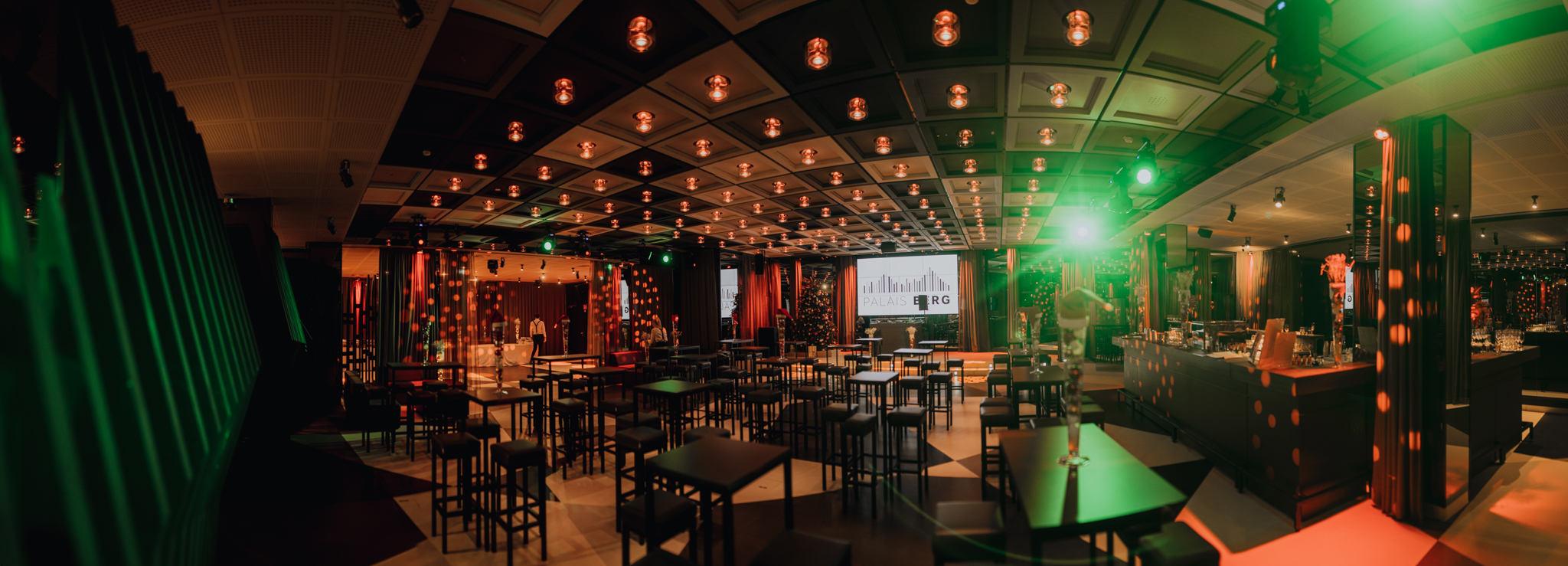In addition, the Palais Berg offers extensive design options as well as cooperation with reliable partners (catering, technology, etc.) In addition, a variety of equipment options (Bar Elements, Gala Tables, Design elements) can be used to meet individual requirements and wishes.